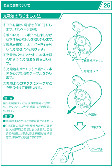 ●ご使用済の製品を廃棄する際は、製品が動作しなくなるまで完全に放電させた後、下記手順に従って充電池を取り出して下さい。